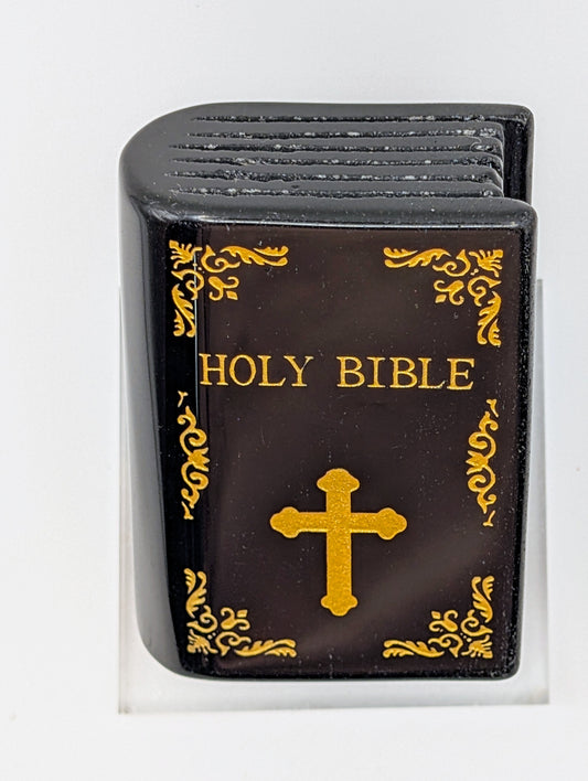 Gorgeous Shiny Black Obsidian Crystal Holy Bible Carving with Golden Intricate Detailing comes with a display stand