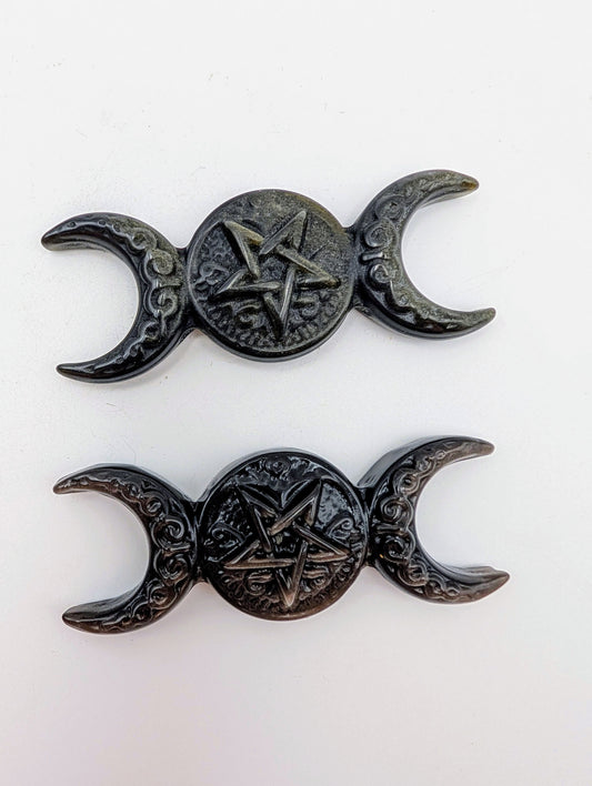 Silver or Golden Sheen Obsidian - Triple Moon with Pentagram Carving