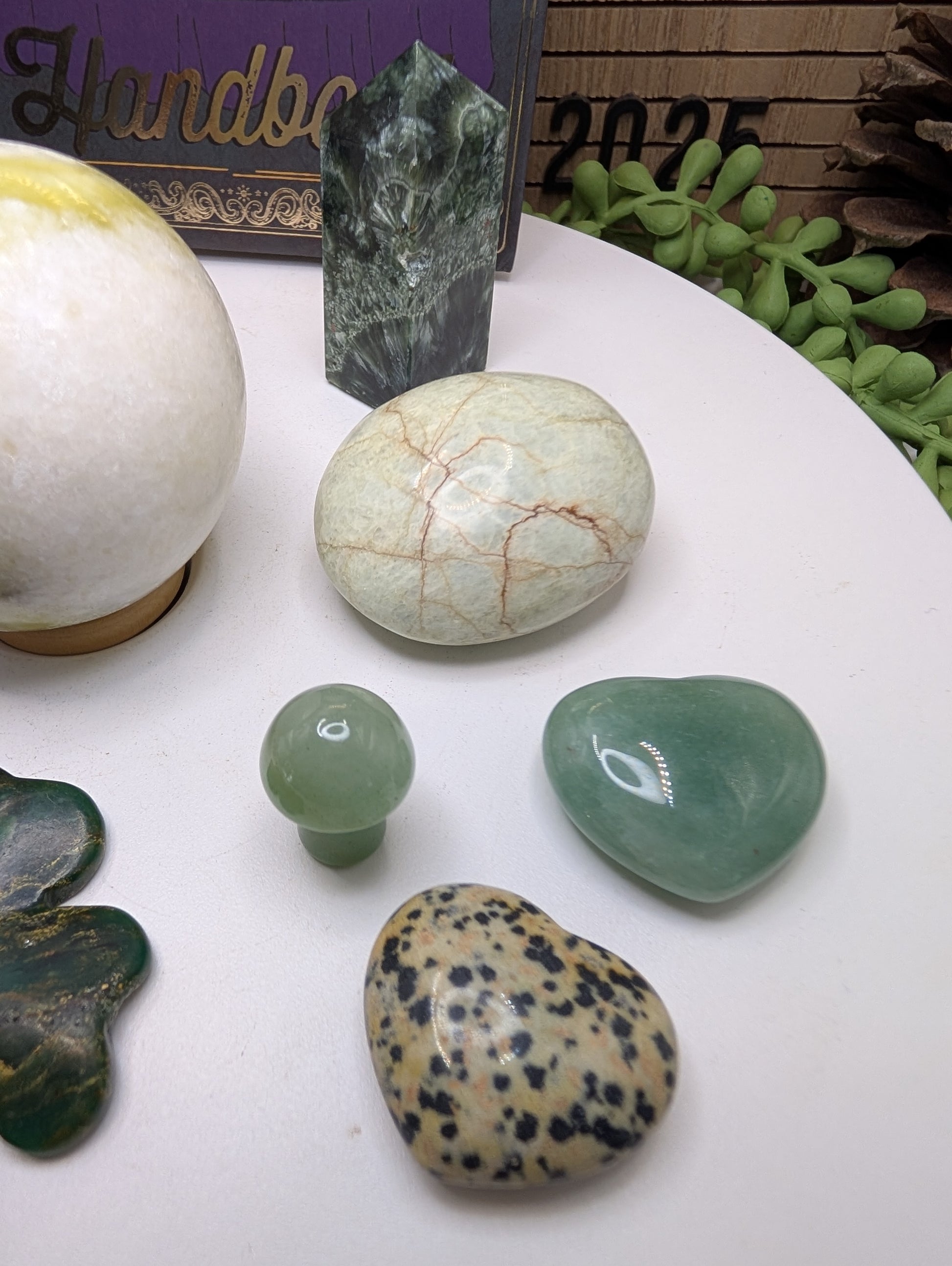 🔮 Keywords: crystal bundle, owl carving, night owl, taichi stone, seraphinite tower, serpentine sphere, amazonite palm stone, moss agate clover, dalmatian jasper heart, green aventurine, agate bracelet, african turquoise bracelet, spell book box, witchy crystal set, moon magic, grounding crystals, spiritual gift set, boho crystals