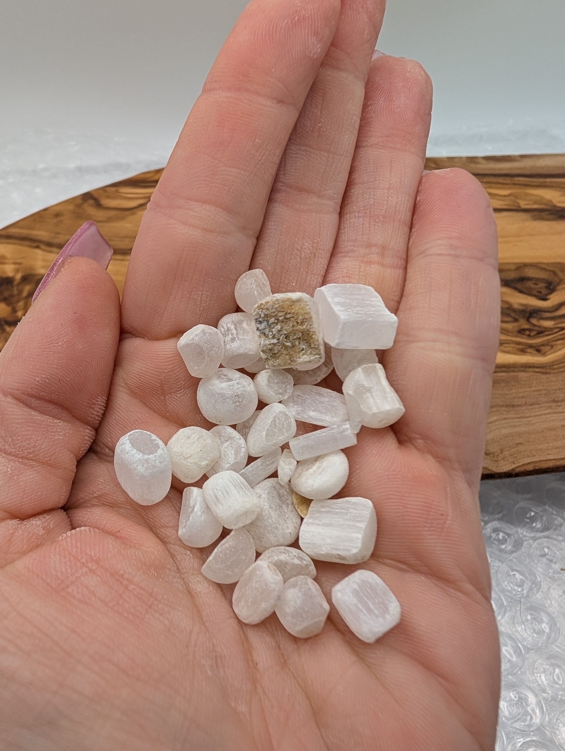 These Selenite Tumbles are a perfect addition to any crystal collection. Selenite is known for its cleansing and energizing properties, making it a great stone to have in your space. Use these tumbles to bring balance and harmony to your environment, while also promoting mental clarity and spiritual growth. Approximately 1 oz of tumbles!